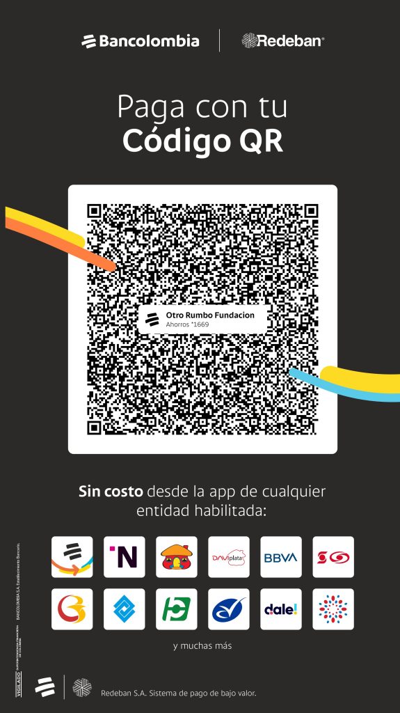 Transferencias a: Cuenta de ahorros 64700001669 Bancolombia a nombre de Otro Rumbo Fundación NIT 900633478. Llave Bre-B 0064781701